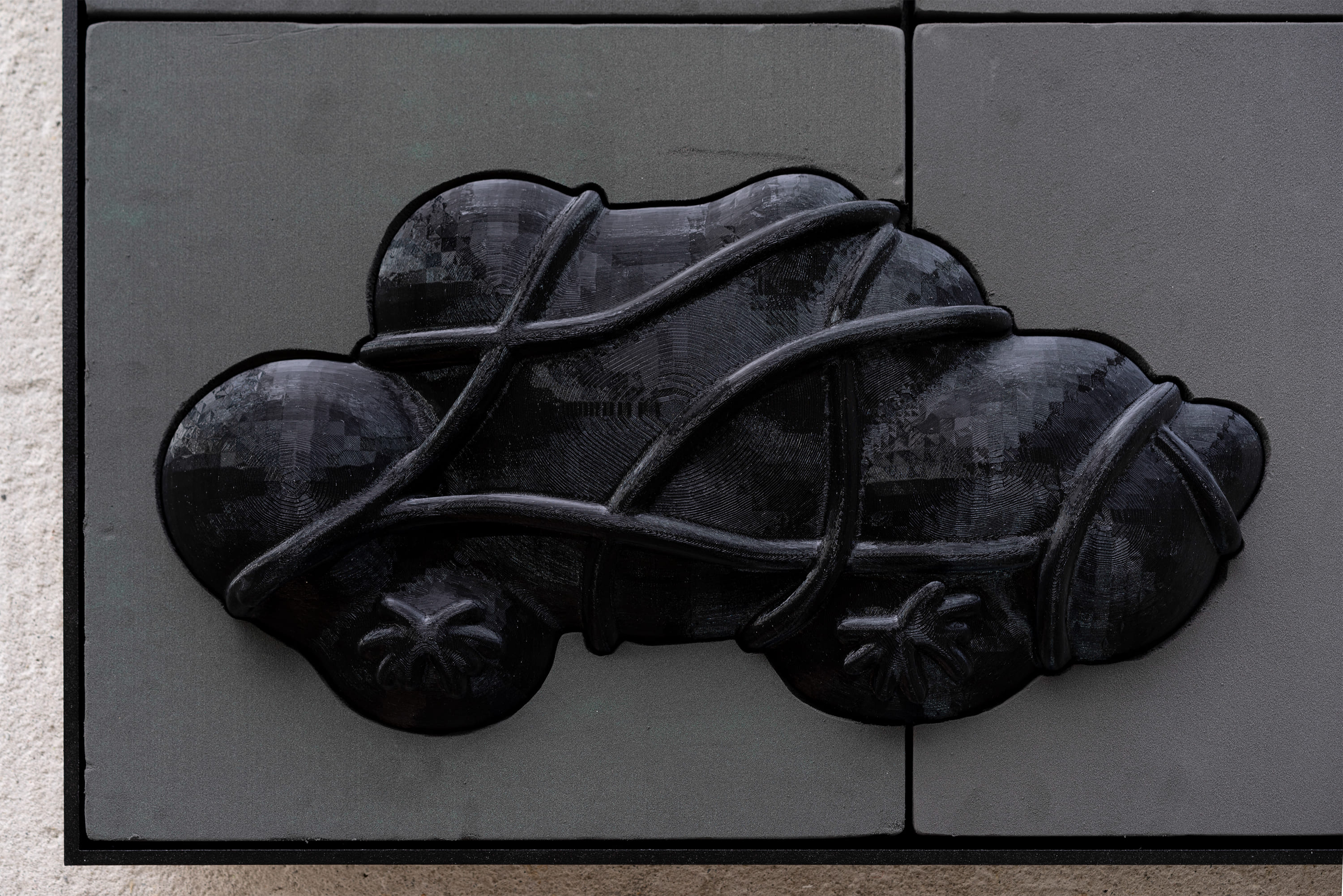 The third group comprises reliefs produced through the thermo-vacuum-forming of EVA foam. As the wooden molds are carved away through milling and the filaments are built up to form the 3D-printed objects, these structures are first filled through thermo-vacuum-forming and then emptied again, revealing newly created cavities within the reliefs and generating a distinct surface language.