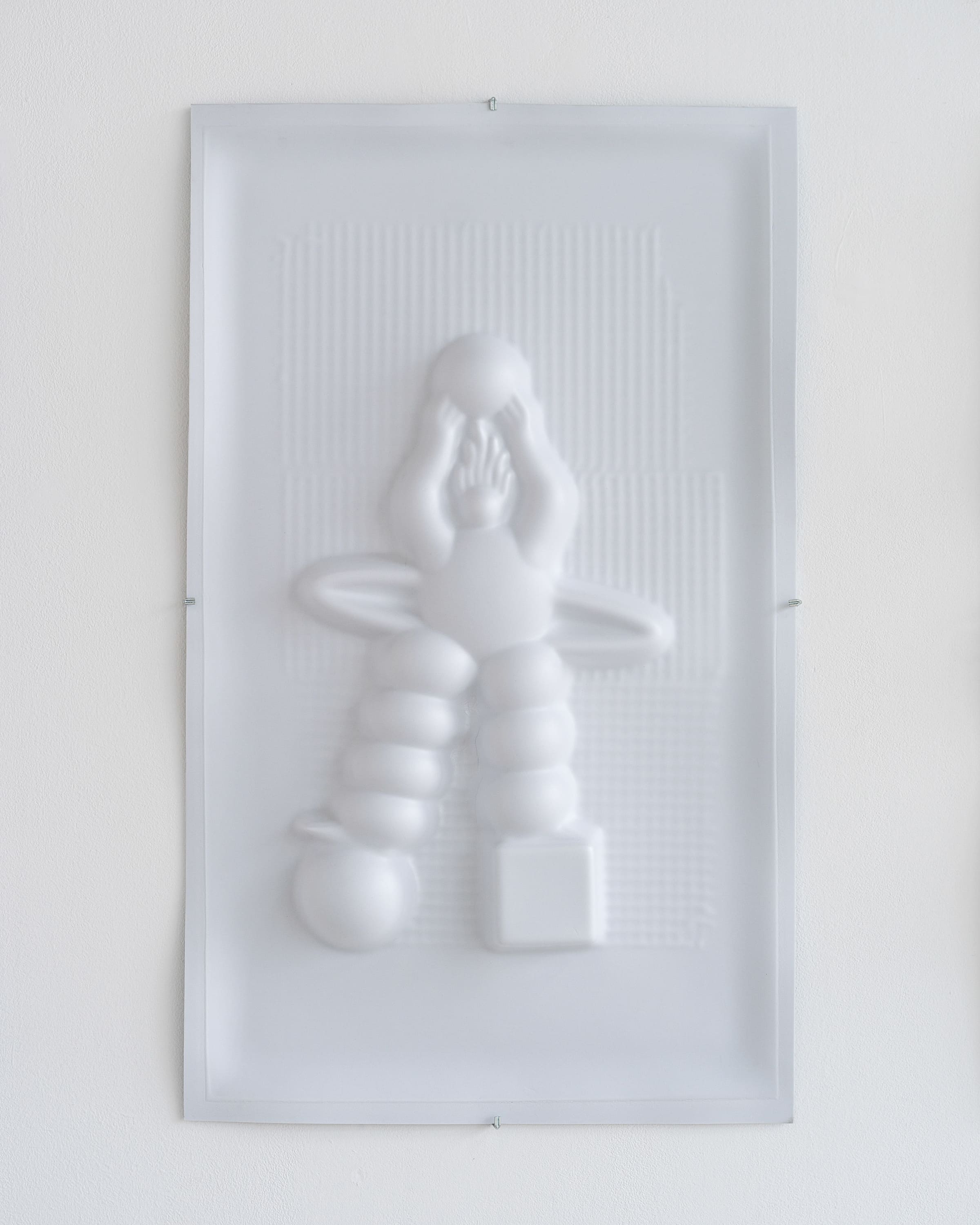 In Emma: f(n)ull (2024–25), the original high reliefs of the earlier textile works become low reliefs through a silicone-driven process of emptying. These low reliefs are then filled with plaster, returning once again to the state of high relief. This sequence is further extended in the works produced through thermo-vacuum forming, in which the textile material transitions from silicone to plastic. Through these multilayered transformations — and through the deliberate contrast “the heaviness of love (Fullness)” and “the lightness of dissolution (Null/Emptiness)” in material weight across textile, silicone, plaster, metal, and plastic — she explores the physical conditions of “fullness and emptiness” across diverse materials, with each transformation enabling newly emerging forms.